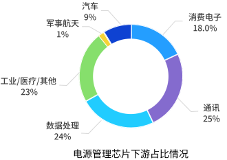 DCDC轉換器是電子設備中的關鍵器件,其性能優劣對電子產品的性能和可靠性有著直接影響,是模擬芯片最大的細分市場之一,廣泛應用于消費電子、通訊、數據處理、工業/醫療/其他、軍事/航天和汽車領域,其中通訊領域的應用最多,為25%。
